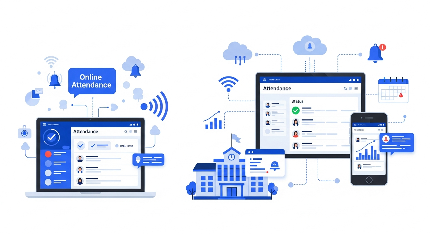 - Online attendance system - Cloud-based or server-hosted software where students or teachers mark presence through a web portal, app, QR code, or integration with learning management systems.