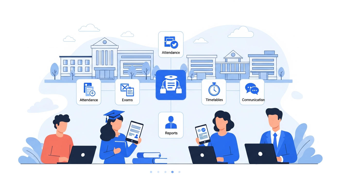 Put simply, it’s an integrated platform that centralizes academic and administrative tasks. It often combines a student information system, fee management, attendance tracking, timetable generation, exam and result processing, and reporting dashboards.